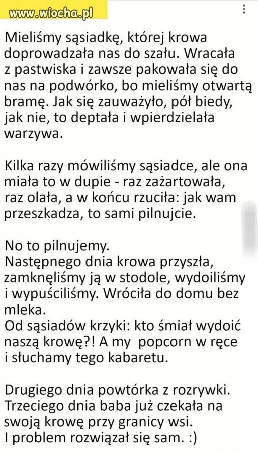 Prawo stanowi, że to co na mojej ziemi to moje. Dopóki jabłko wisi na gałęzi drzewa sąsiada nad moją ziemią, to jego, jak spadnie to moje. Pewnie z krową i kurami to samo.