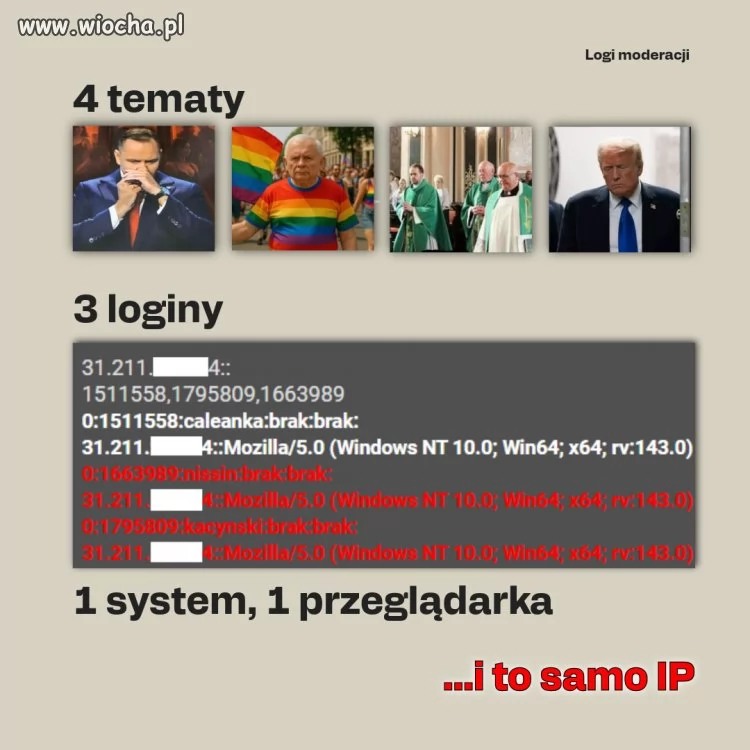 Trudno się nie zgodzić MTeresaJP (pierwszy komentarz do tej wrzuty), albo coś jest zgodne z regulaminem albo nie jest. Czy można mieć legalnie kilka kont na tej stronie? Można. Czy każdy tak robi? Nie, bo w sumie po co - jak dla mnie to strata czasu. No i największe ALE: Admin nie rób wiochy swoim zachowaniem, bo wygląda to jakby jakiś "wujek" załatwił ci fuchę, przy której chcesz się wykazać. Nie podoba się, to zmień regulamin na jeden użytkownik-jedno konto, a nie udostępniaj logów i informacji poufnych, bo to siara jest i nawet nie zwykła "siara" tylko "SIARA" w robocie admina.