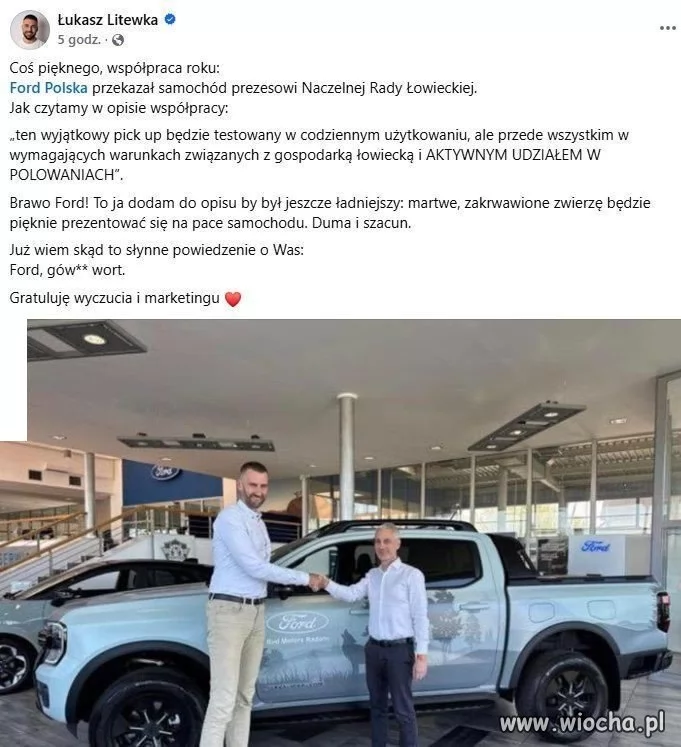 Kiedyś było "Z kamerą wśród zwierząt" a teraz "z Fordem wśród zwierząt". Tylko mam watpliwości, po której stronie kierownicy zwierzę będzie bardziej zdziczałe.