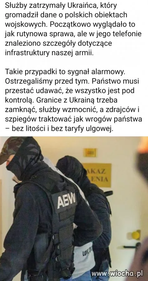 Terenia,kto to są wy ?(taki macie przekaz) . Sam tu gadałeś, że tylko kaczor widzi jakiś wy, ale sam pleciesz tak samo. Chyba czas na lekarza. A odnośnie absurdu,coraz więcej tych szpiegujących Ukraińców w Polsce,co to tak ruskich nienawidzą,że aż dla matuszki rasyji pracują.