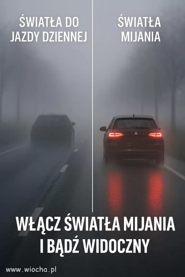 Durnie które minusują, zdaje się nie znają przepisów. Wyjaśniam więc - światła do jazdy dziennej mogą być używane tylko przy NORMALNEJ przejrzystości powietrza. Ale również jesienią/zimą. Natomiast przy "zmniejszonej przejrzystości powietrza, spowodowanej mgłą, opadami atmosferycznymi lub innymi przyczynami" (czyli np tak jak na obrazku) należy obowiązkowo włączyć światła mijania lub przeciwmgłowe przednie albo oba te światła razem. I obowiązuje to przez cały rok, nie tylko jesienią/zimą. No ale trzeba te przepisy znać.
