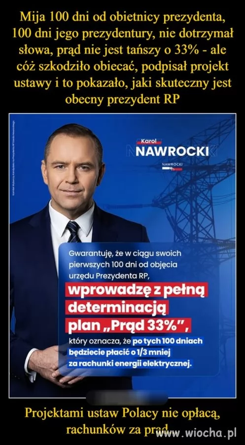 Tak, tak nie dotrzymał. Hańba mu. Projekt ustawy "Tani prąd -33%" jest naprawdę dobry. Świetny sposób, na ulżenie gospodarstwom domowym w trakcie transformacji energetycznej w kraju. Na czas budowy elektrowni atomowej i rozwijania OZE, Polacy będą mogli płacić mniej za prąd. Ciekawe, czy rząd zajmie się tym projektem. Wiadomo, że premier nie może sobie pozwolić na odniesienie sukcesu przez prezydenta. Z drugiej strony jak powiedzieć wyborcom, że nie będą mnie płacić, bo ucierpi jego interes partyjny? 🤷