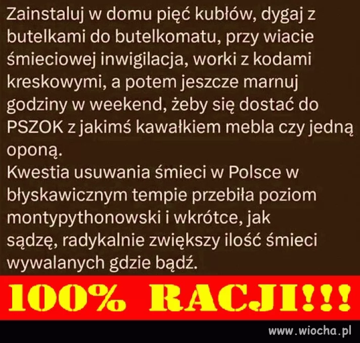 😱😱😱 łooooo matko, jakie to straszne wyrzucić plastikową butelkę do żółtego, papier do niebieskiego, a zmieszane do czarnego. A jeszcze szanowny tygrysek co tydzień meblościankę w domu i opony w samochodzie zmienia. Tęsknisz widzę za wywalaniem byle czego, byle gdzie.