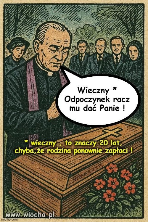 Nie rozumiem logiki katolików. Na pogrzebie smucą się, choć wierzą, że zmarły będzie zaraz u boku boga. Ksiądz gada wieczny odpoczynek, a ja myślałem że w raju będzie wieczne życie i wieczna radość, z wiecznego zdrowia i wiecznej miłości! A nie. Kościół sobie wymyśli czyściec, oczywiście nie za darmo! Czyli co? Chrystus kłamał na krzyżu? "Za prawdę powiadam Wam dziś jeszcze będziecie ze mną w raju...".