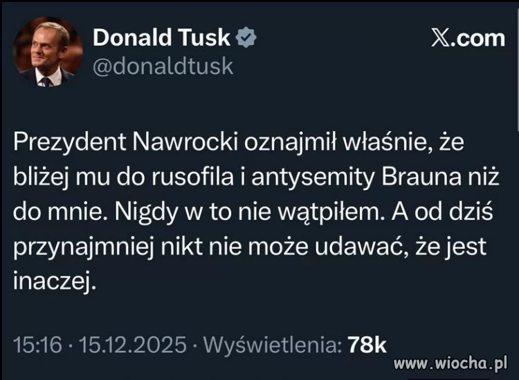 Nawrocki powiedział: "Donald Tusk jest dziś premierem, więc - w mojej ocenie, w obecnej sytuacji - szkodzi Polsce bardziej". Nie ma nic, że "bliżej mu" do Brauna. Ale kto by oczekiwał, że Tusk powie prawdę 🤷