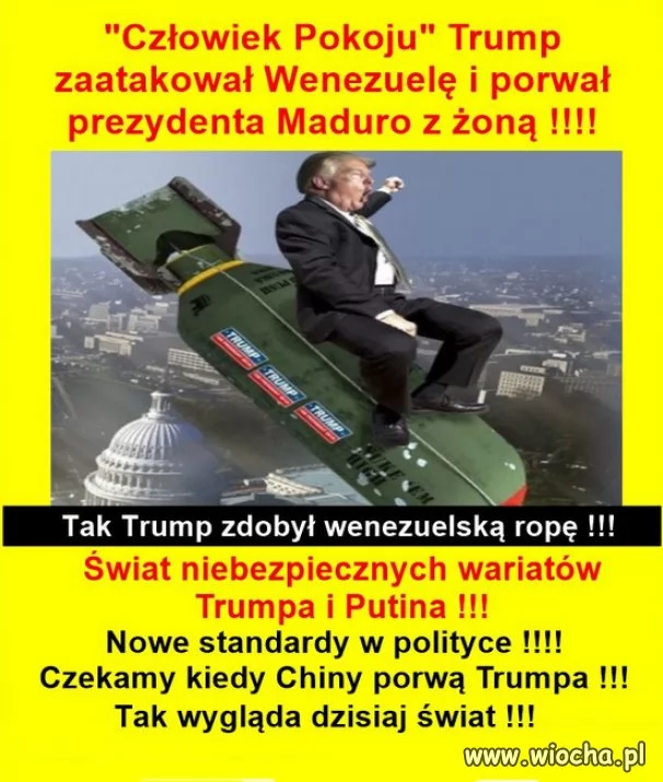 Trump pokazał Chinom co można robić z Tajwanem czy Hong-Kongiem. Gdy trzy mocarstwa zaczną robiić co chcą to IIIWŚ murowana. A w Wenezueli może się okazać ze porwane dyktatora to za mało aby obalić dyktaturę. Kraj się tylko pograży w krwawej wojnie dommowej. A może też nawet z krajami obok. Tam będzie jak po obaleniu Sadama jakieś ISIS tylko katolickie.