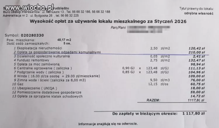 1117 złotych tyle trzeba zapłacić za sam czynsz w Grudziądzu, dla mieszkania, w którym jest zameldowanych 5 osób. To dużo, czy mało? W Grudziądzu zarabia się przeważnie 3500-4500 na ręke. A jak jest u was?
