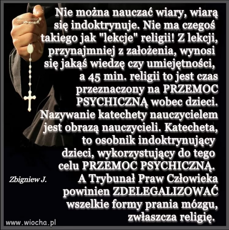 Zgadzam się. straszenie piekłem, jeśli nie pójdziesz na mszę. Straszenie piekłem jak się nie wyspowiadasz. Straszenie opętaniem gdy oglądasz anime, lub czytasz Harrego Pottera. Sadzanie dzieci na kolanach księdza. Znęcanie nad dziećmi w placówkach opiekuńczych. Zbieranie pieniędzy na biskupów bez moralności... Dalej wymieniać nie będę. Bóg nie istnieje, bo najbardziej cierpliwy i miłosierny wysłałby kilka piorunów