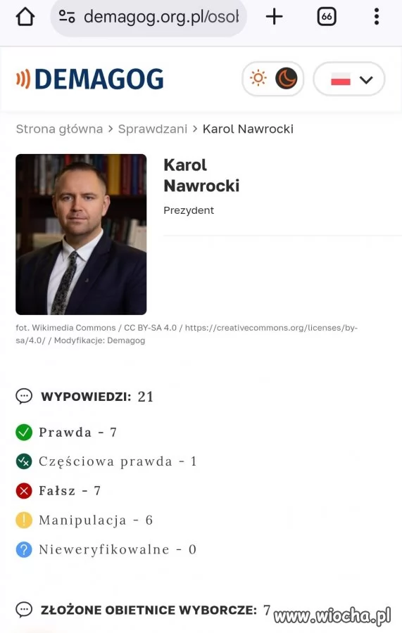 zgadnij o kim: WYPOWIEDZI: 59 Prawda - 20 Częściowa prawda - 3 Fałsz - 16 Manipulacja - 15 Nieweryfikowalne - 5 ZŁOŻONE OBIETNICE WYBORCZE: 100 Złożona - 0 Zrealizowana - 5 Zrealizowana z opóźnieniem - 12 Częściowo zrealizowana - 35 Zamrożona - 5 W trakcie realizacji - 0 Działania niepodjęte - 0 Niezrealizowana - 43