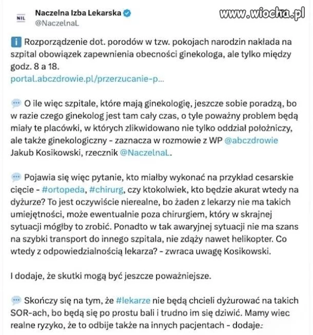 W dwa lata osiągnęli ponad połowę tego co PiS w 8 lat. Mają rozmach s.....syny. Rozporządzenie nakłada na szpital obowiązek zapewnienia ginekologa tylko miedzy 8 a 18. Naczelna Izba Lekarska lamentowała wtedy i lamentuje teraz, z tym że teraz doszły dodatkowe argumenty, które możesz przeczytać wyżej.