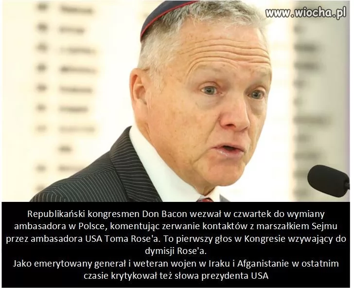 Republikanin jest pierwszym kongresmenem, który zaapelował o zmianę ambasadora w Polsce. Bacon należy do umiarkowanego skrzydła partii i jest częstym krytykiem polityki zagranicznej administracji Donalda Trumpa. Jako emerytowany generał i weteran wojen w Iraku i Afganistanie w ostatnim czasie krytykował też słowa prezydenta USA, umniejszające rolę żołnierzy z państw NATO w Afganistanie. - onet.pl/6 lutego 2026