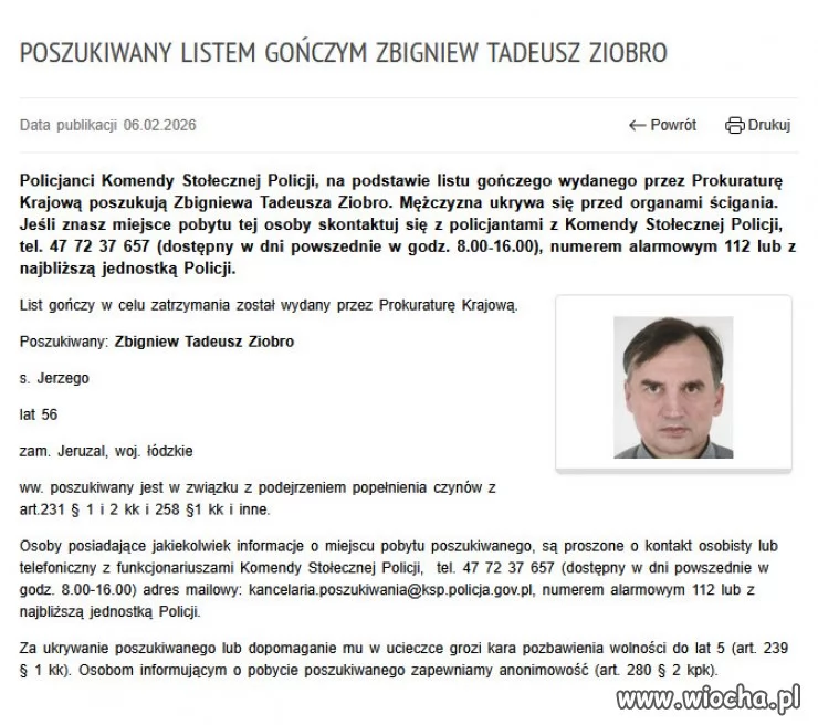 „Prokurator wydał postanowienie o poszukiwaniu podejrzanego, byłego ministra sprawiedliwości Zbigniewa Ziobry, listem gończym”