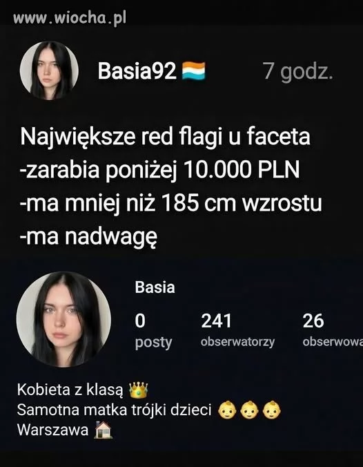 Największe red flagi u kobiety. 1. Ma dzieci. 2. Każde z innym facetem. 3. Każdy z tych facetów żyje a ona mimo to Ona szuka kolejnego. 4. Sama nie ma pracy ani wykształcenia a chce faceta, który ma wykształcenie i dobrą pracę. 5. Sama jest za wysoka jak na kobietę powyżej 180 to już żyrafa a dyskryminuje niskich chłopów. 6. Pewnie sama nie ma idealnie płaskiego brzucha.